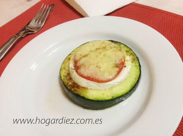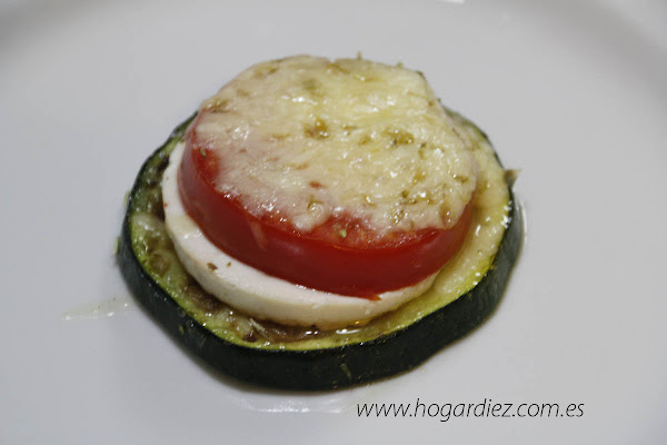 Preparación:Cortar en rodajas el calabacín, los tomates y el queso fresco. Marcar en la plancha el calabacín hasta que esté dorado. Ponemos encima de la bandeja del horno una lámina de papel de hornear y encima vamos colocando una rodaja de calabacín, ya marcado, encima una rodaja de queso fresco, otra de tomate y por encima añadimos una rodaja de mozzarella. Una vez tenemos la bandeja de horno llena de los montaditos, los rociamos con orégano o albahaca. Horneamos a 200º durante 5 minutos aproximadamente y tenemos nuestro entrante listo.