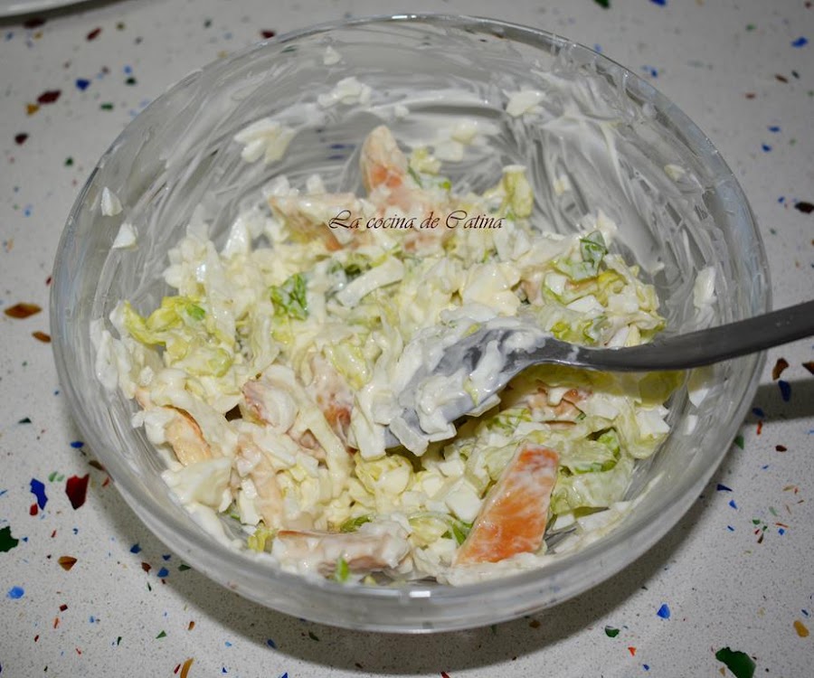 Mezclamos en un bol la lechuga, las tiras de pollo, la cebolleta picada, la clara de huevo duro troceada y 3 cucharadas de mayonesa.