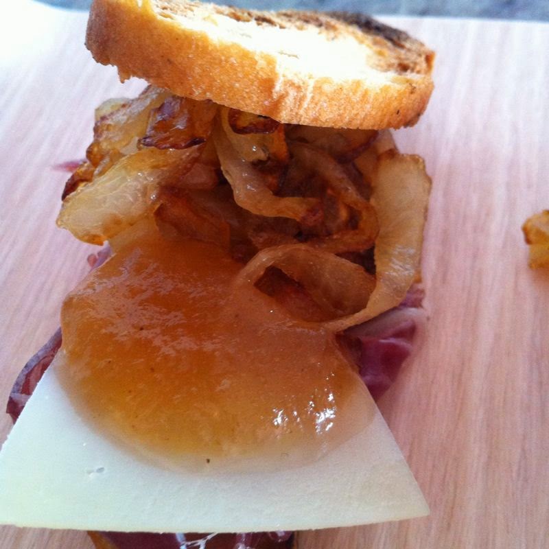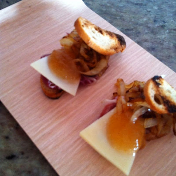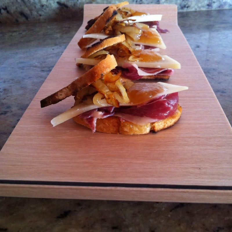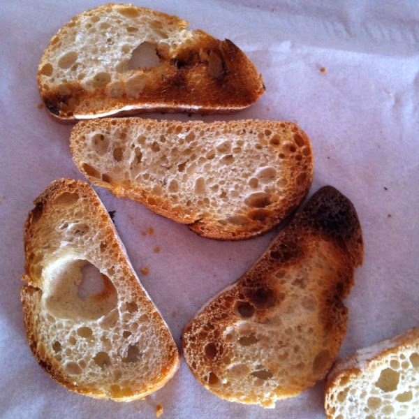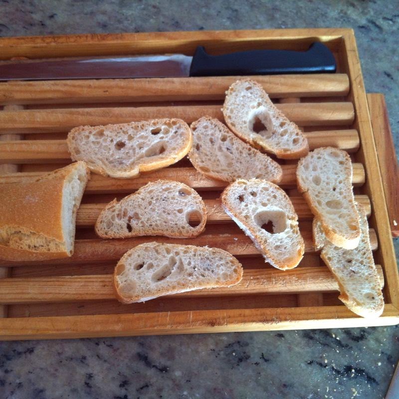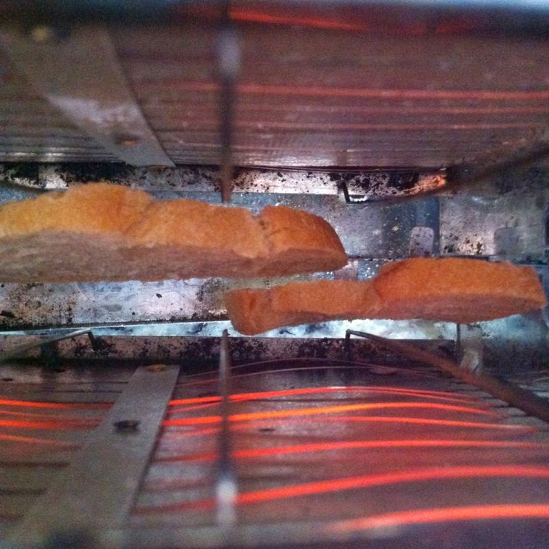 Mientras se nos hace la cebolla, iremos tostando las rebanadas de pan. Han de ser muy finas, y utilizaremos dos por cada montadito.