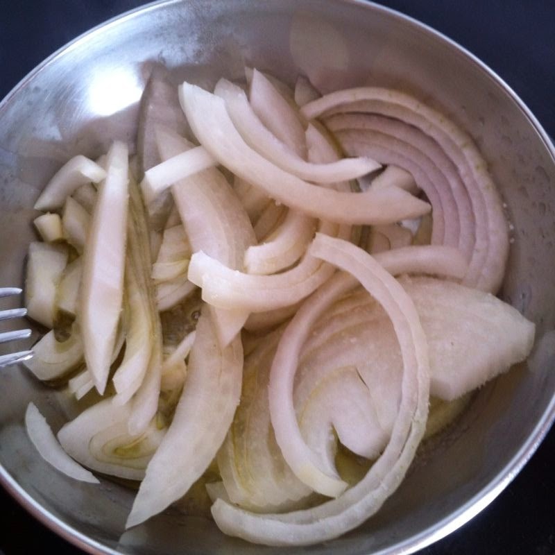 Para hacer este montadito tan rico y fácil, empezaremos cortando en juliana la media cebolla, y poniéndola a pochar en una sartén con un chorro de aceite de oliva y un poco de sal a fuego medio.