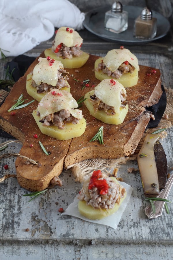 Pelamos las patatas y las cortamos en rodajas, las salpimentamos, ponemos encima de cada rodaja una cucharada de la carne y encima un trozo de queso.