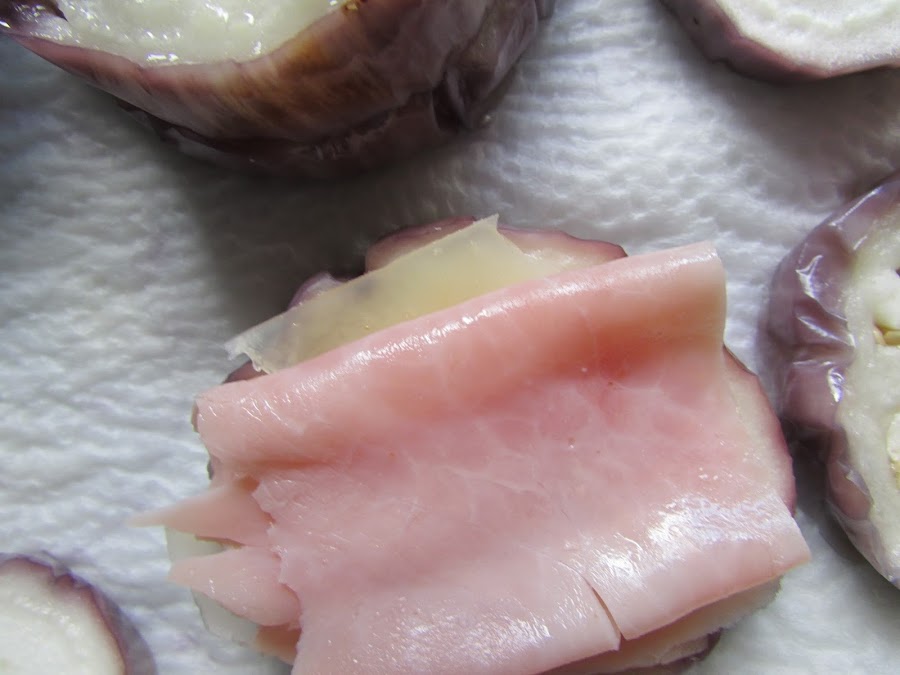 Con el otro relleno procedemos igual, berenjena, queso, jamón y berenjena
