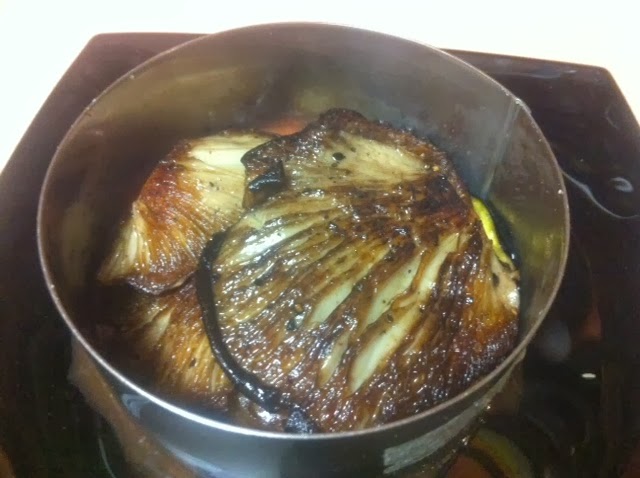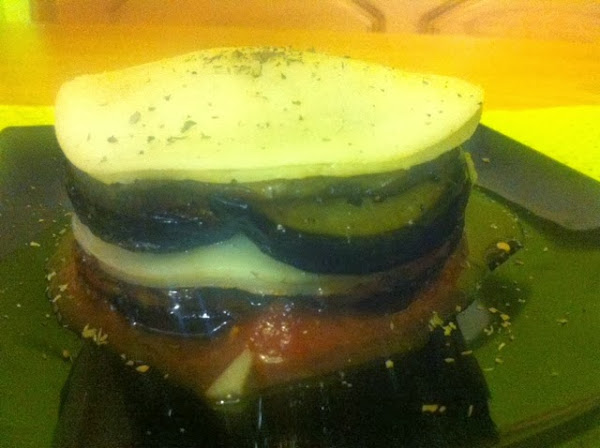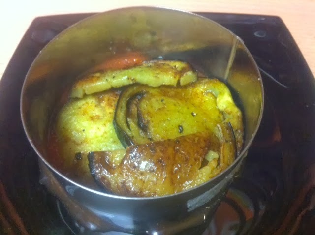 Ahora, en el plato en el que vais a servir, poner el aro en el centro y echar un par de cucharadas grandes de tomate, poner encima una capa de rodajas de berenjena a la plancha, otra de setas y poner una loncha de queso. Volver a poner berenjena, setas y queso y espolvorear con un poco de orégano.