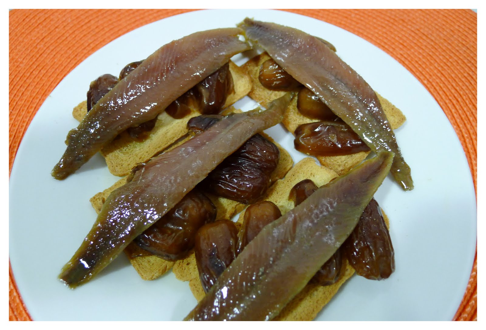 tan facil como colocar un par de datiles abiertos, a los que previamente les habremos quitado el hueso sobre el biscote,encima disponer una o dos anchoas(segun tamaño) y listo! mas facil imposible!!