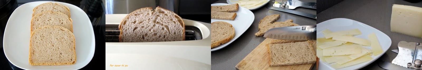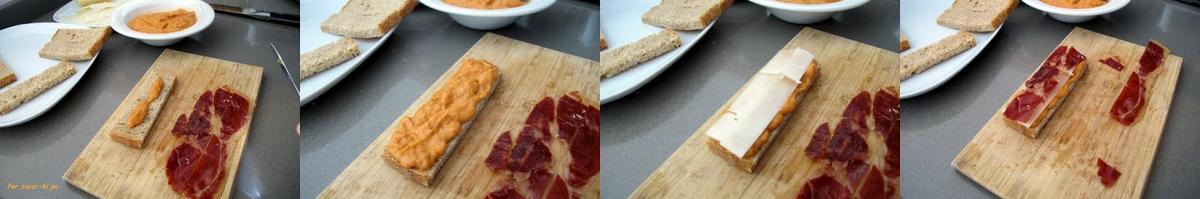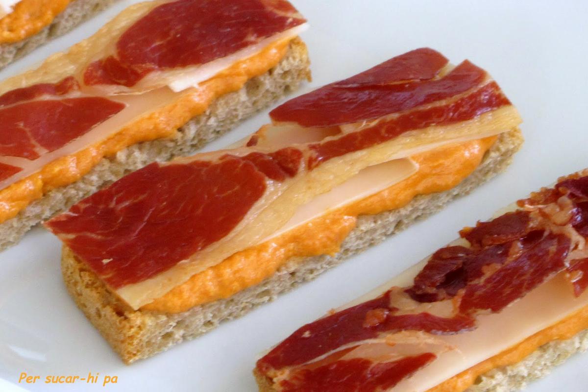 Sobre la pieza de pan extender una generosa capa de crema de tomate y jamón, cubrir con láminas de queso y acabar con un loncha de jamón de la medida del pan.