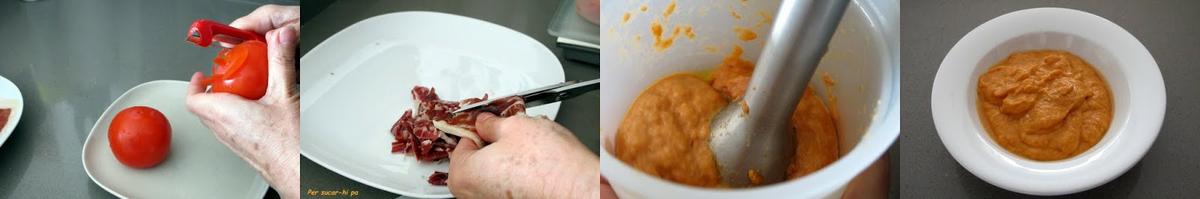 Cortar el jamón en trozos pequeños desechando, si las hubiera, las partes duras (tendones por ejemplo). Colocar junto a los tomates y triturar con la batidora hasta obtener una crema homogénea.