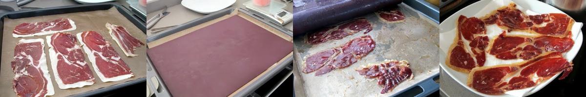 Colocar en una bandeja de horno una lámina de silicona (o papel de horno) y extender encima las lonchas de jamón. Cubrir con otra pieza de silicona ( o papel de horno) y colocar un peso encima, por ejemplo una bandeja plana que encaje. Introducir en el horno caliente y dejar cocer unos 10 minutos a 180º. Pasado este tiempo comprobar la cocción de las lonchas de jamón, el punto es crujiente pero que no queden secas y se rompan al manipularlas. Si están muy crudas dejarlas unos minutos más, pero controlando que no se pasen.