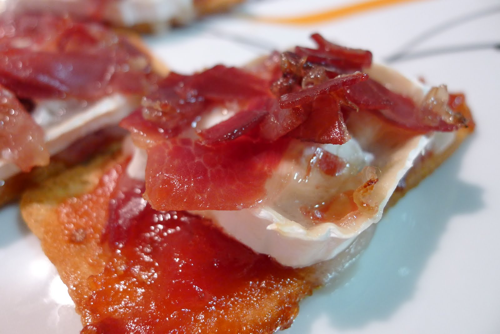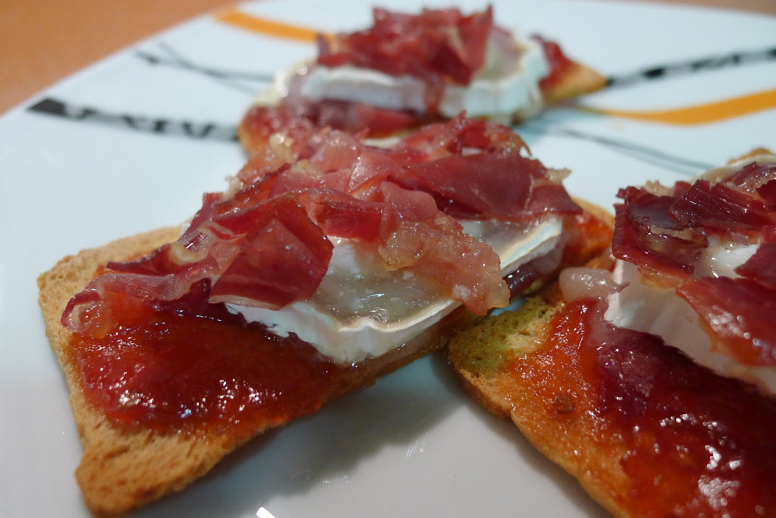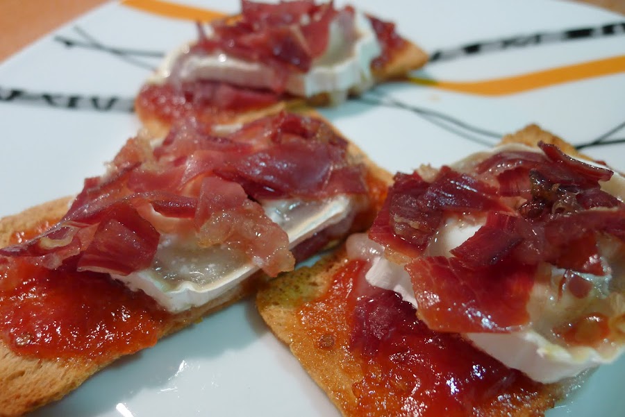 Que titulo mas laaargo! pero es que no se me ocurria que nombre otorgarle a estos bocados tan sumamente exquisitos! Si el jamon de paleta iberica esta que se sale...la confitura de tomate raf desde luego no se queda atras... y ya,junto al queso de cabra medio fundido,todo juntito en un panecito...bueno bueno...lo mejor es probarlo!