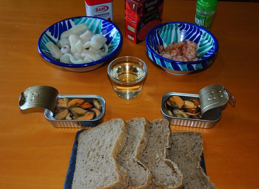 100 gr. de gambas cocidas, 2 latas de mejillones al natural, tomate frito tipo casero, 250 gr. de anillas de calamar, un vaso de vino blanco, una cucharadita de pimentón dulce (opcional), perejil, sal, pimienta, aceite y cuatro rebanadas de pan (puede ser chapata, casero, de panificadora con mezcla de centeno, como he utilizado yo, etc.)