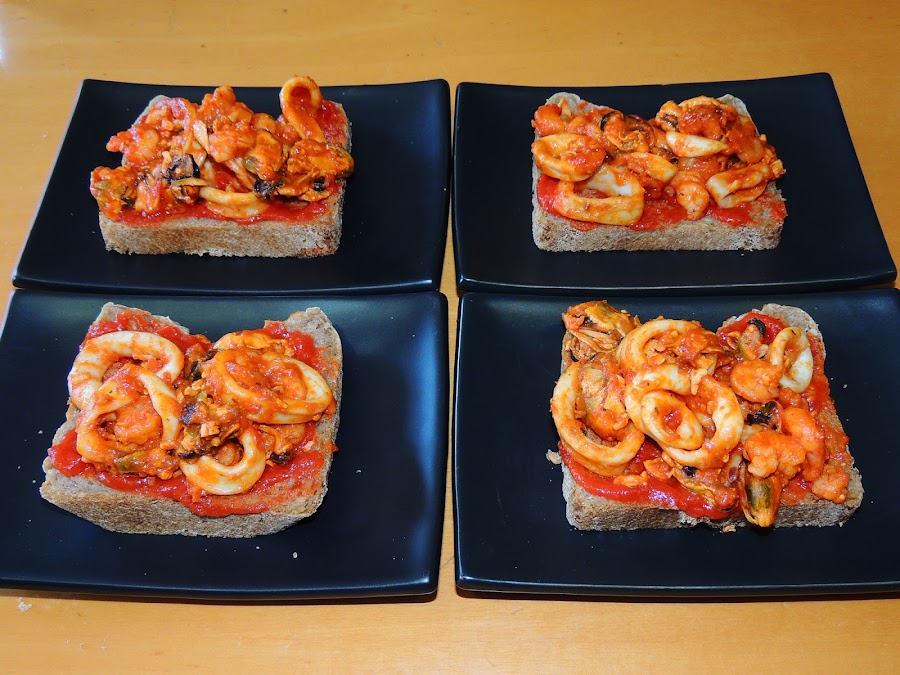 Se le pone una pequeña base de tomate frito y por encima, la mezcla de marisco.