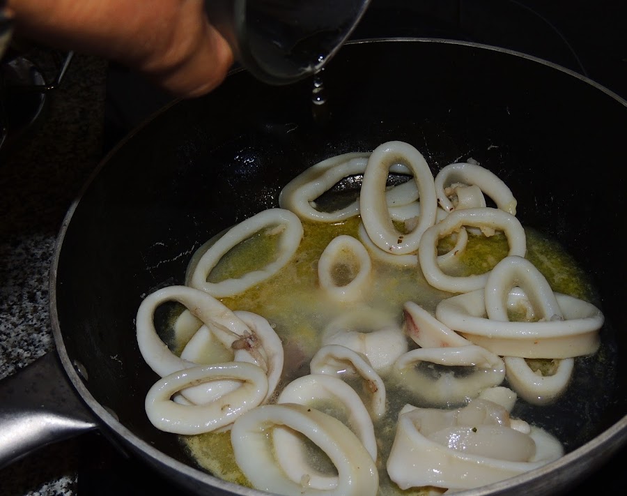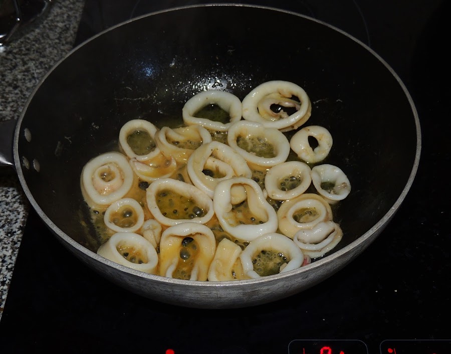 Se ponen los calamares descongelados en una sartén con un poco de aceite hasta que se pongan blancos. Se les añade sal y pimienta.