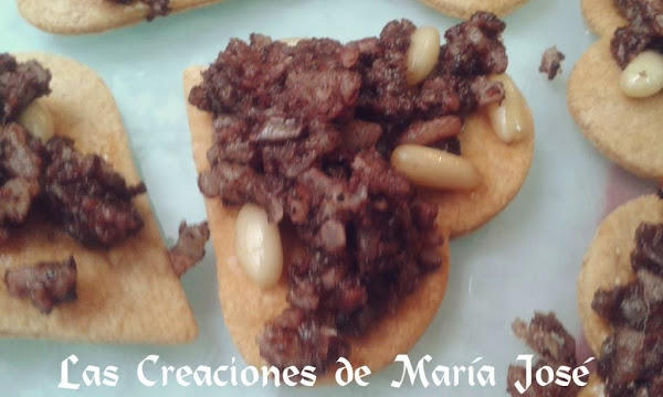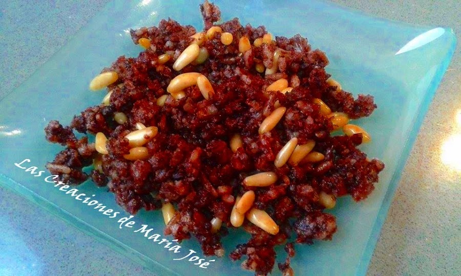 Quitar la piel de la morcilla y echar el interior en una sartén, desmigarlo bien y remover. Echar una cucharada de aceite de oliva, remover y echar los piñones. Remover bien que se mezclen los piñones con la morcilla y echar medio vasito de vino. Dejar al fuego hasta que se disuelva un poco el vino, pero no dejéis de remover de vez en cuando. Yo lo coloque en unos corazones que hice con masa brisa y estaba bueniisimo.