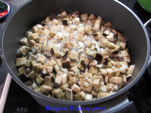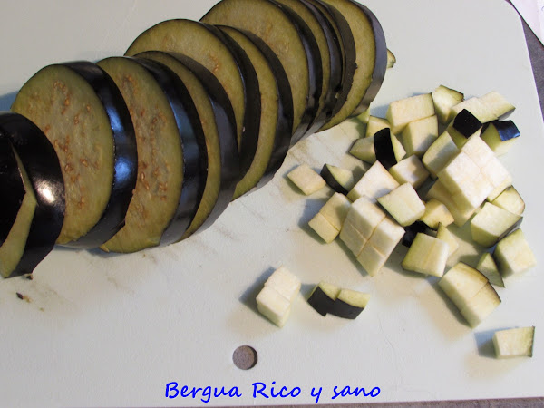 1. Cortamos en trocitos la berenjena y la cebolla.