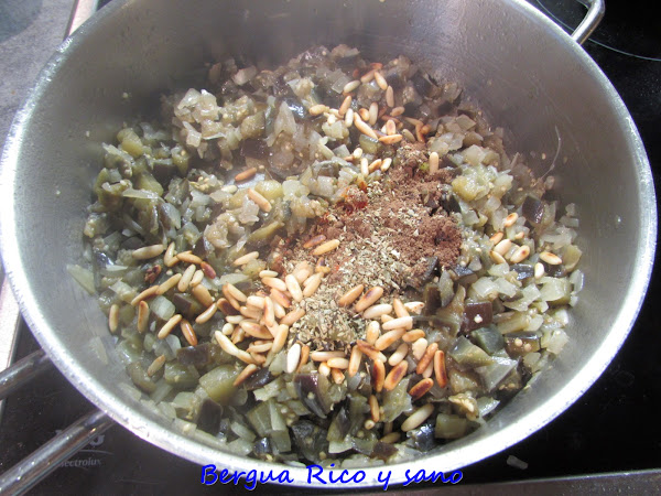 4. Incorporamos las especias y los piñones un poco tostados y mezclamos.