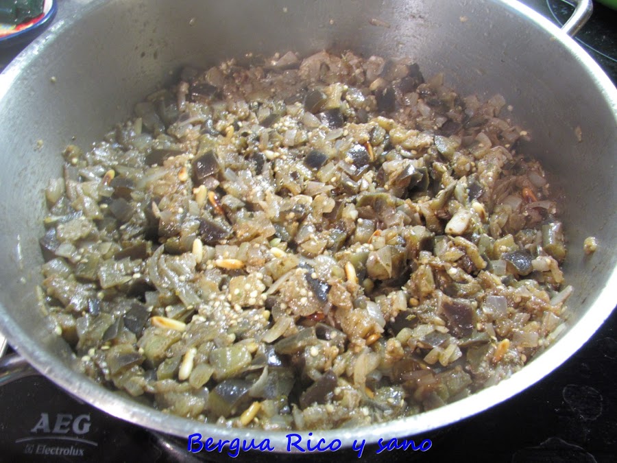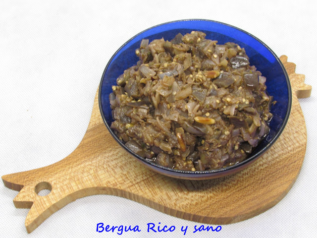 Se hace con berenjena, cebolla, piñones y especias. Pero no sabe a berenjena, te lo digo yo, que no soy amante de las berenjenas precisamente. Da el pego. Para hacer apreciar esta receta, hay que entender que se parece a las morcillas de mi tierra; de la Vega Baja y la huerta de Murcia. No son morcillas prietas como la de arroz del norte. Son morcillas blandas, de textura untable y sabor suave en el que son protagonistas las especias: clavo, canela, pimentón ahumado, orégano, sal y pimienta. La morcilla de verano puede ser "blanca" o "parda", según si se deja la piel de la berenjena o no.