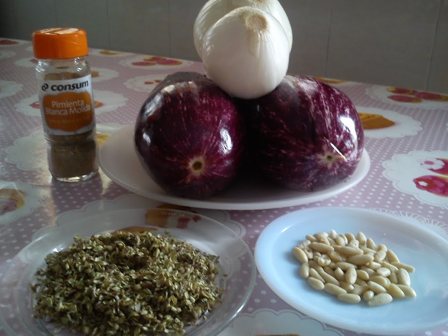 En la misma sartén pongo un chorrito de aceite de oliva y doro un poco los piñones y añado el puré de berenjena y lo remuevo todo, lo pruebo y rectifico de sal, pimienta y orégano hasta que me sepa como la morcilla de cebolla.