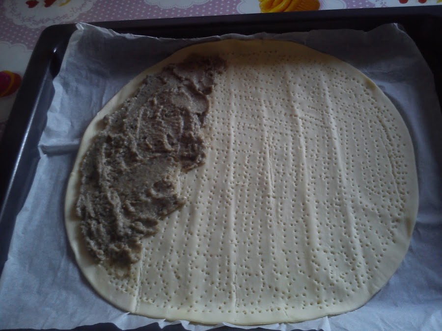 Bueno y ahora la sorpresa final como hice mucha y sobró he hecho para cenar una especie de coca rápida con una masa de hojaldre refrigerado bien pinchadita para que no suba, excepto el borde.