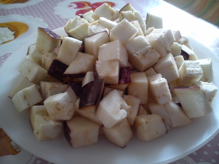 Luego añado la berenjena cortada a dados con piel y todo, y la dejo unos 15 minutos dándole vueltas para que se poche junto con la cebolla.