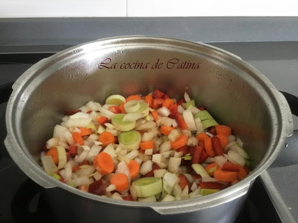 Cuando sacamos la carne, en la misma olla echamos las verduras picadas y las freímos a fuego lento, hasta que las veamos bien pochadas.