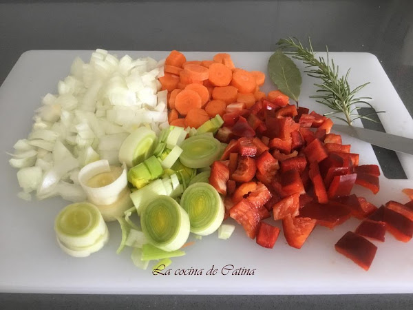 Mientras se dora la carne, pelamos y picamos las verduras, cebolla, puerro, zanahoria y pimiento rojo.
