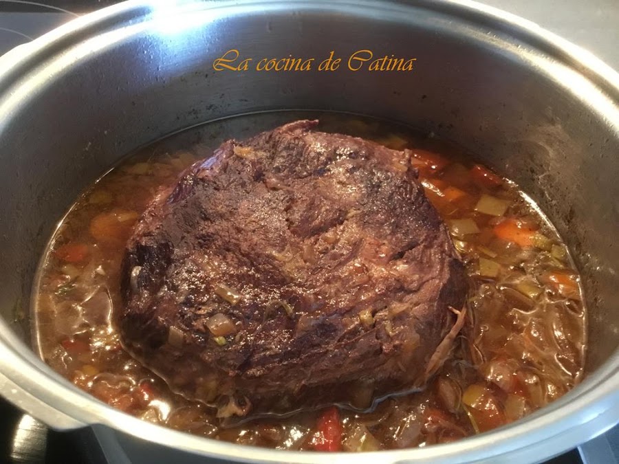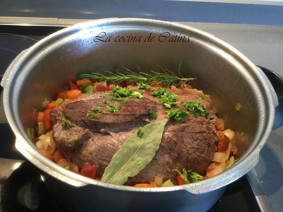 Incorporamos el morcillo a la olla, y añadimos un vaso de vino de tinto que tenga calidad, 1/2 vaso de agua, la hoja de laurel y las otras hierbas (ajo y perejil picado) y dejamos cocer todo a fuego lento durante dos horas. Si no tenemos tiempo de dejar cocer durante dos horas podemos optar por utilizar olla rápida (yo lo he cocinado así), dejando cocer durante 40 minutos.