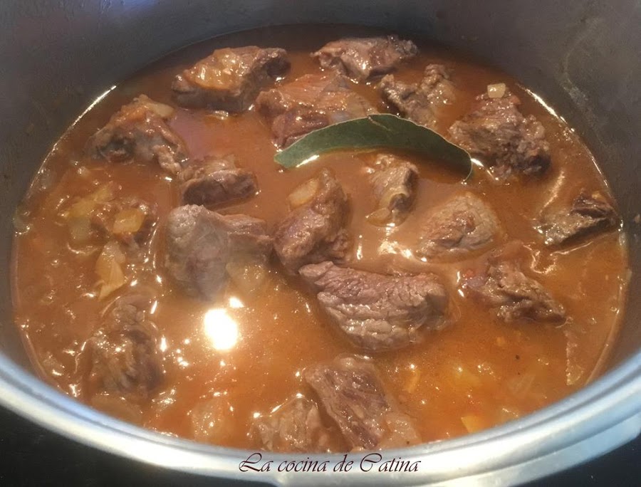 Ponemos la carne reservada en la cazuela con las hojas de laurel, el vino blanco, sal y pimienta, cubrimos con agua y cocemos a fuego lento durante una hora y media aproximadamente.