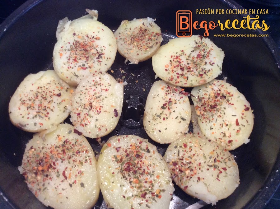 Las patatas yo al final las abrí por la mitad, las coloqué en la cubeta de Cecofry y las espolvoreé con un poco de chimichurry y una gota de aceite, 5 minutos. Pero puedes servirlas tal cual salen del cestillo.