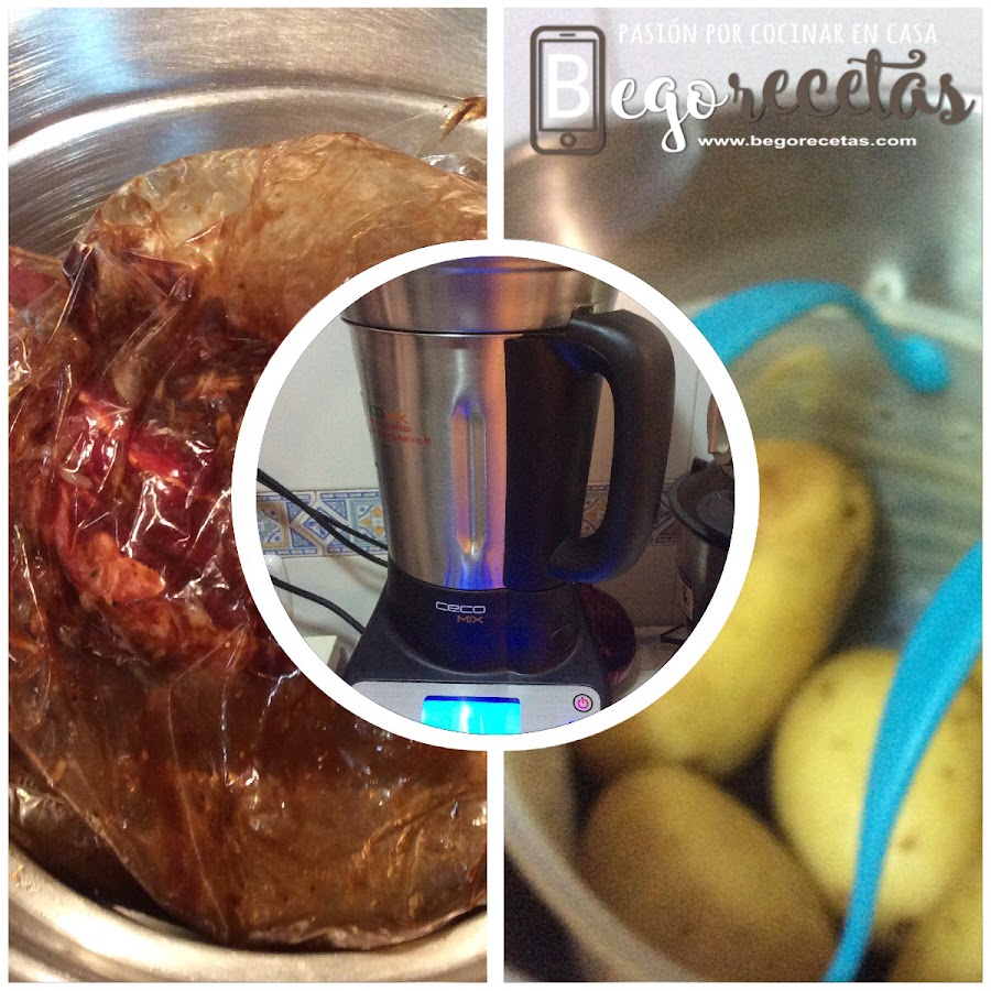 En el vaso de cecomix ponemos agua hasta cubrir las cuchillas, y encima colocamos un cestillo con las patatas dentro. Yo utilizo uno de silicona que compré en Amazon y que va perfecto! (Si quieres saber más, mándame un mail a begorecetas@begorecetas.com y te paso el enlace ;) )