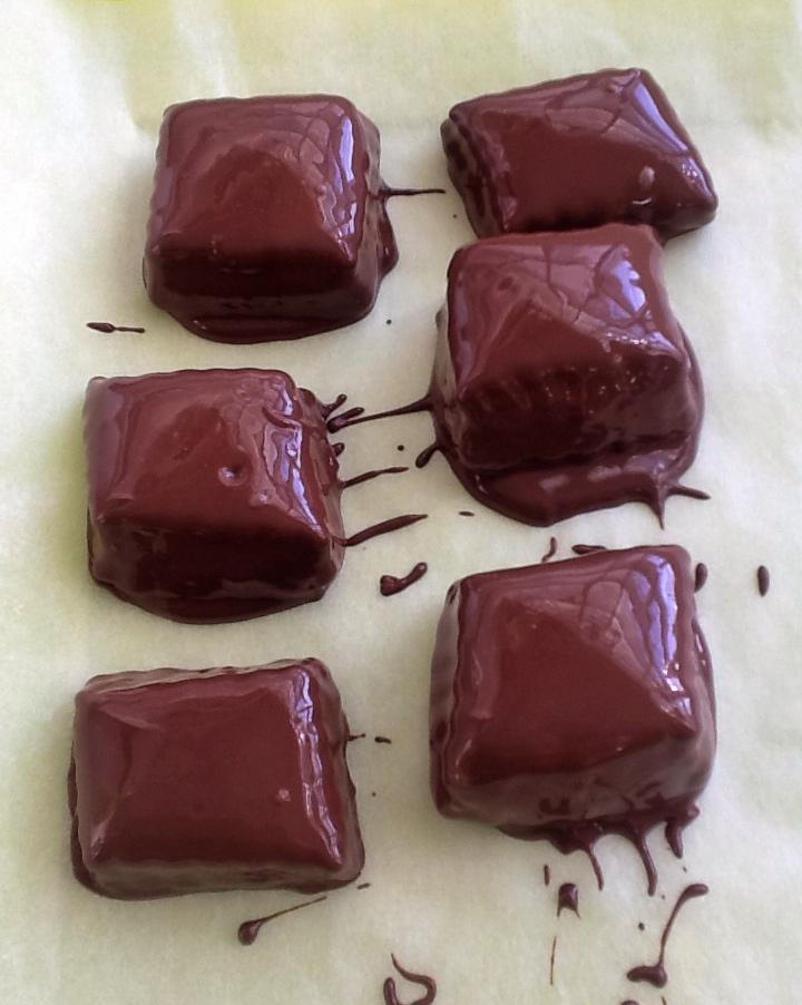 Sumergimos los nevaditos sin azúcar glass en el chocolate, sacamos con un tenedor dejando que caiga el exceso de chocolate y los dejamos sobre papel de hornear.
