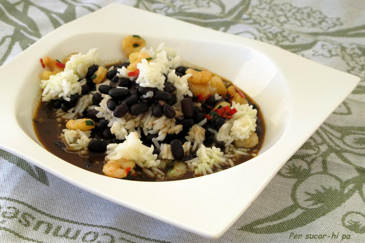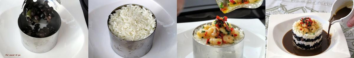 Para montar el plato utilizamos un aro y alternamos dos capas de alubias y dos de arroz. Colamos el caldo de la cooción de las alubias y vertemos alrededor de la base. Colocamos encima unas cuantas gambas con su aderezo. Y a disfrutar!