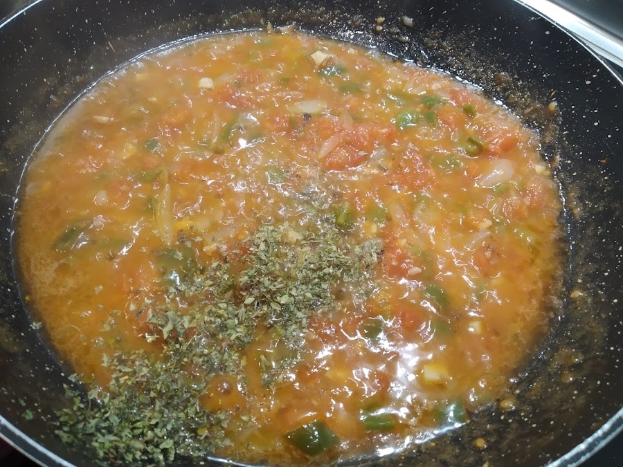 Una vez hecho el refrito incorporar el comino, la pimienta negra, el orégano, las dos hojas de laurel y el pimiento molido, salar al gusto y remover bien a fin de que se integren todos los ingredientes.