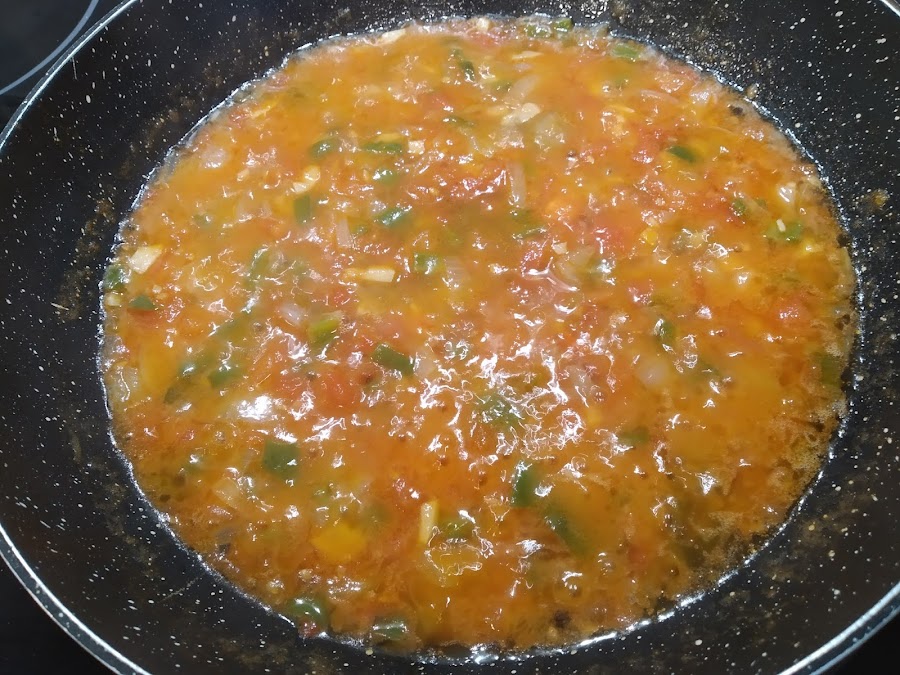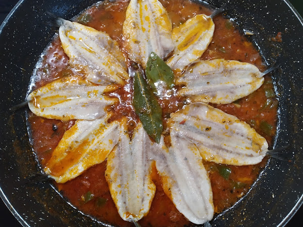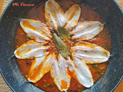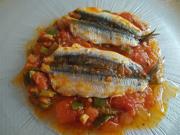 Retirar del fuego, colocar los boquerones sobre el refrito (suelo colocarlos con la piel hacia abajo para ir comprobando que se hagan correctamente) tapando la sartén a fin de que el pescado se haga con el calor residual.