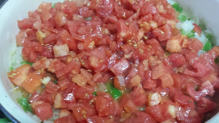 Salteamos unos minutos y añadimos el tomate pelado y troceado menudo.