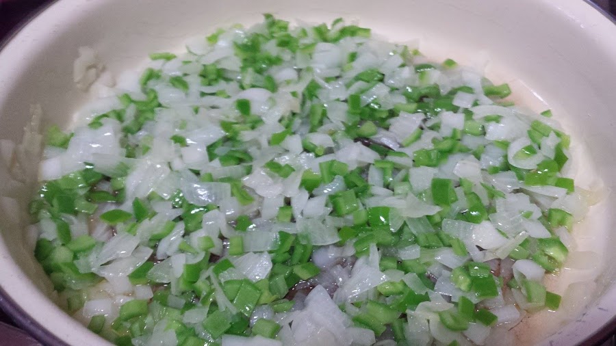 En una cazuela con un poco de aceite sofreímos la cebolla bien picada. Cuando esté pochada, agregamos el pimiento también bien picado.