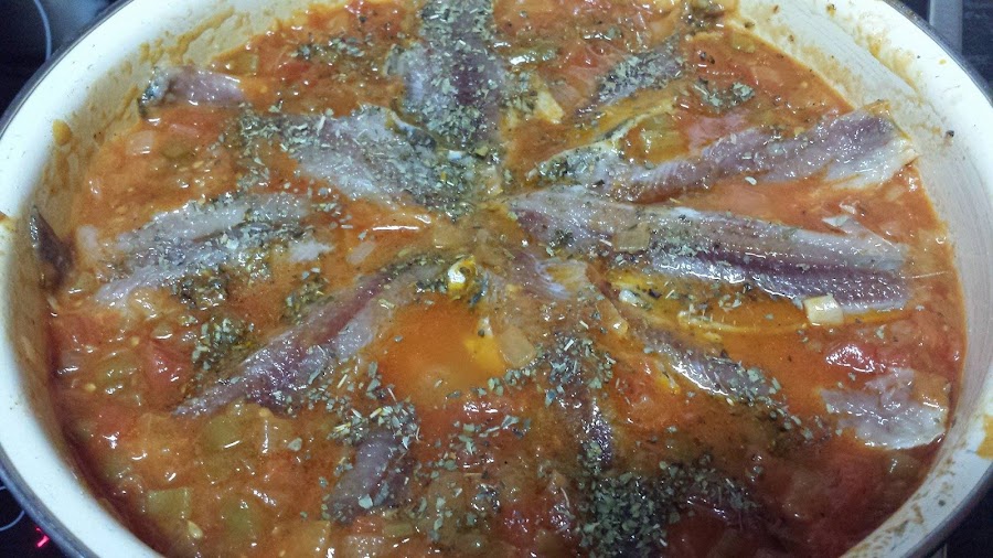 Repartimos las sardinas en la cacerola y espolvoreamos con orégano y dejamos cocinar unos minutos hasta que veamos que las sardinas están hechas.
