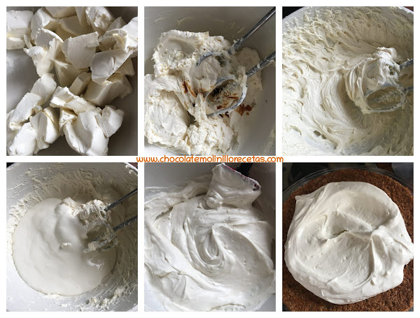 Batimos el queso crema hasta que se haga cremoso, añadimos el azúcar glass y la vainilla y seguimos batiendo, añadimos la crema para batir y batimos por más tiempo hasta que incremente su volumen y quede cremosa.