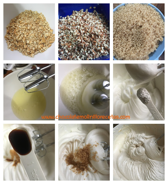 Batimos las claras a punto de turrón, cuando están firmes añadimos el polvo para hornear batimos otro poco y agregamos la vainilla, batimos otro poco y vamos agregando el azúcar mascabado y batimos otro poco después de cada adición, debe quedar esponjoso.
