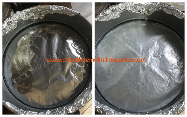 Preparación del Molde: A mí me gusta utilizar un molde desmontable, lo malo es que se me perdió la base, así es que hay que tratar de solucionar, entonces la fabrico con un poco de papel aluminio cuidando que no se rompa, posteriormente engraso la base con aceite en aerosol (para no romper el aluminio) y le coloco un círculo del diámetro del fondo de papel encerado, posteriormente lo engraso.