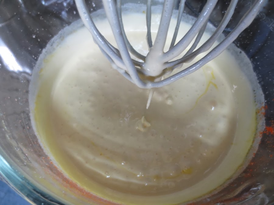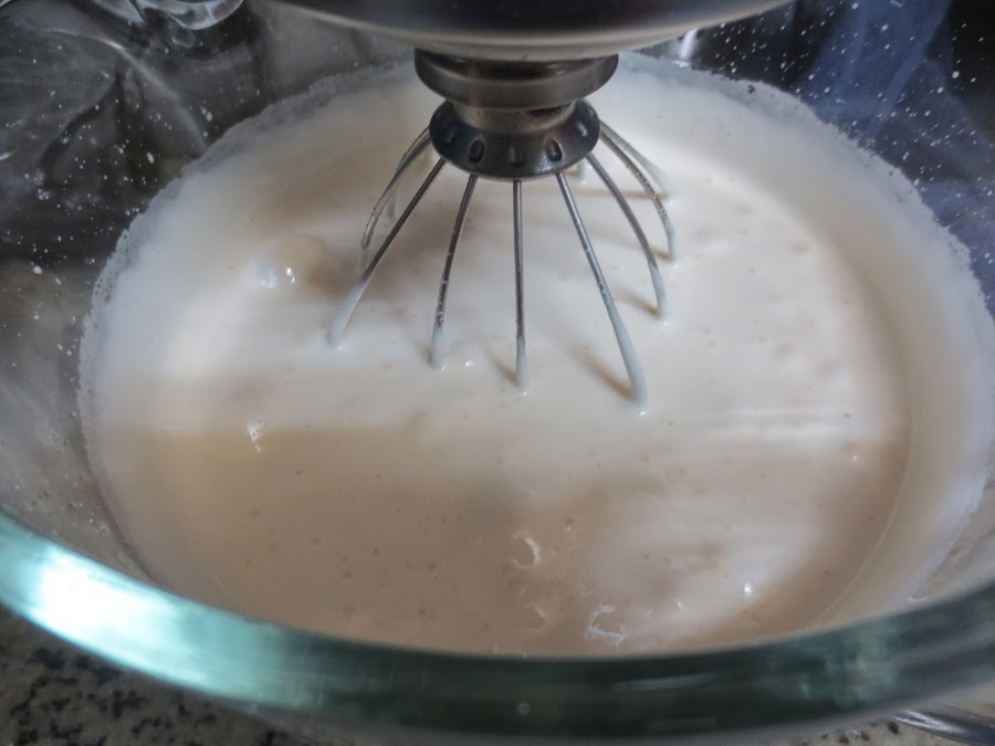1- Colocar la varilla y blanquear los huevos con el azúcar y pizca de sal, unos 5 minutos a máxima velocidad.