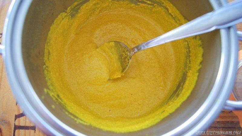 Colocar en una cazuela a fuego medio la mostaza en polvo, ajo, cúrcuma, sal, azúcar y agua mineral integrando constantemente con ayuda de una varilla hasta que sea una mezcla homogénea unos 5 minutos aproximadamente desde que empiece a borbotear y siempre moviendo constantemente.Retiramos del fuego.