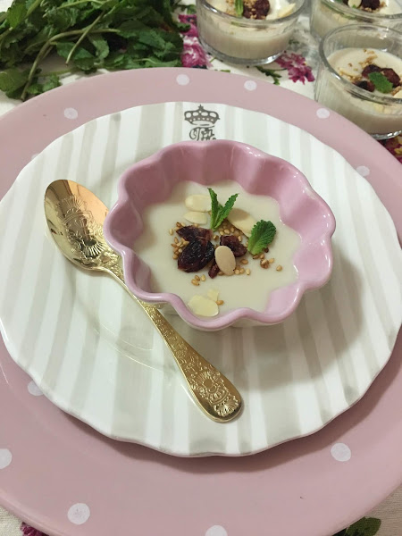 Se sirve acompañado de los frutos secos picados, los liofilizados espolvoreados y con una hojita de menta.