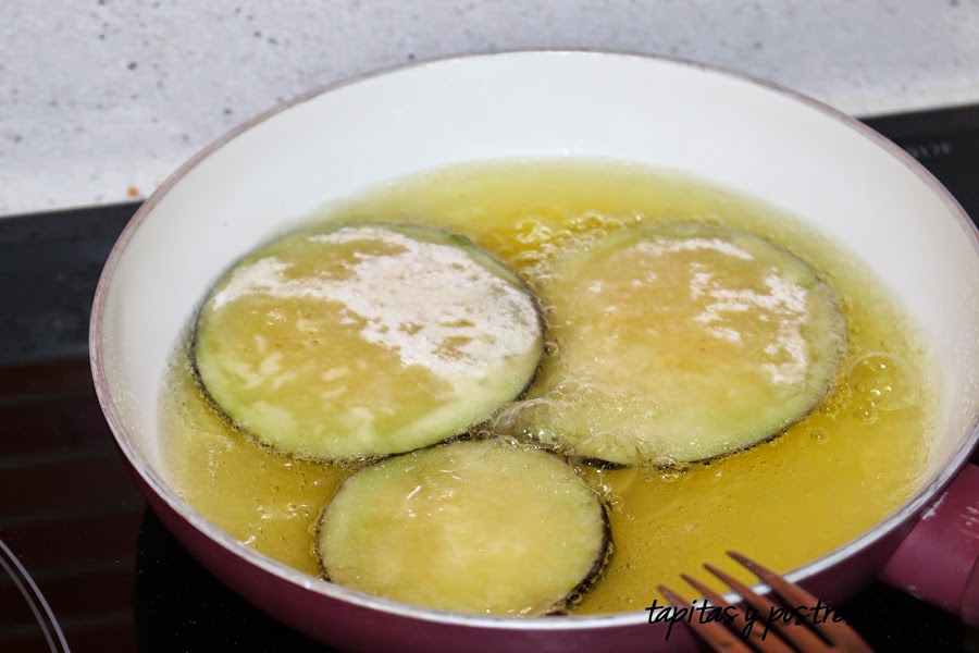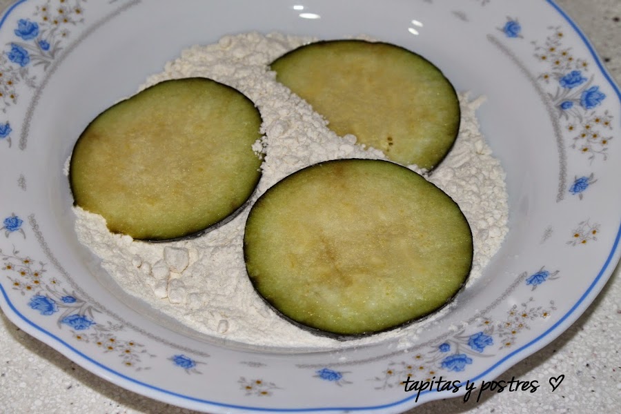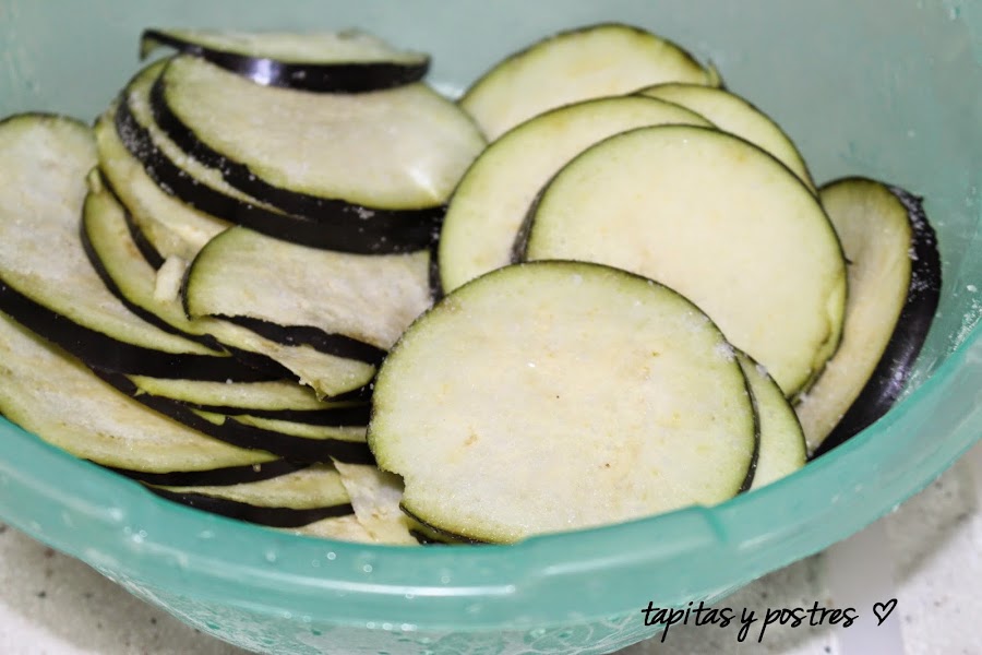 Ponemos las berenjenas, en rodajas finas, en un bol con sal, durante una media hora.
