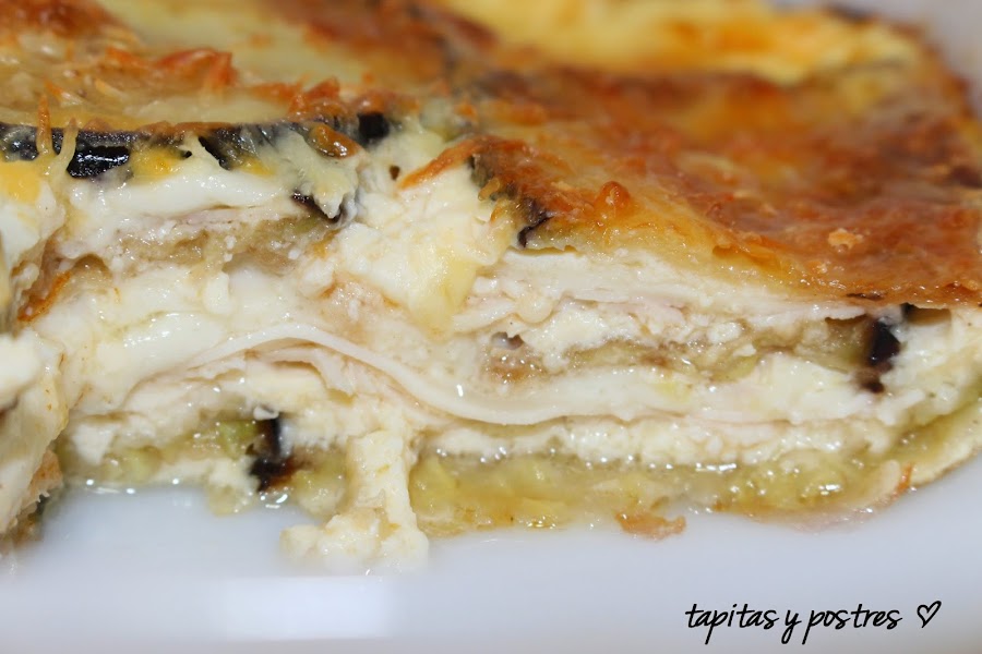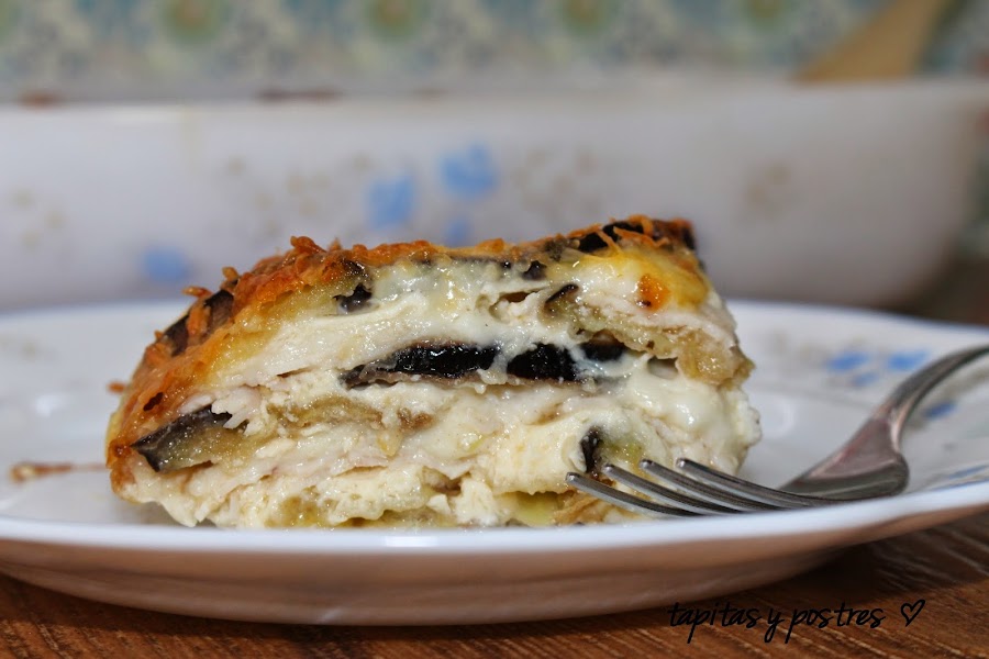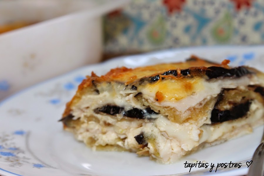 Es una versión más ligera de la clásica mousaka, en lugar de carne picada, lleva jamón york y queso. Es un plato suave, no muy pesado y que se puede dejar preparado con antelación, solo para meter en el horno.
