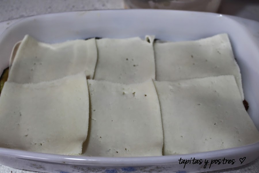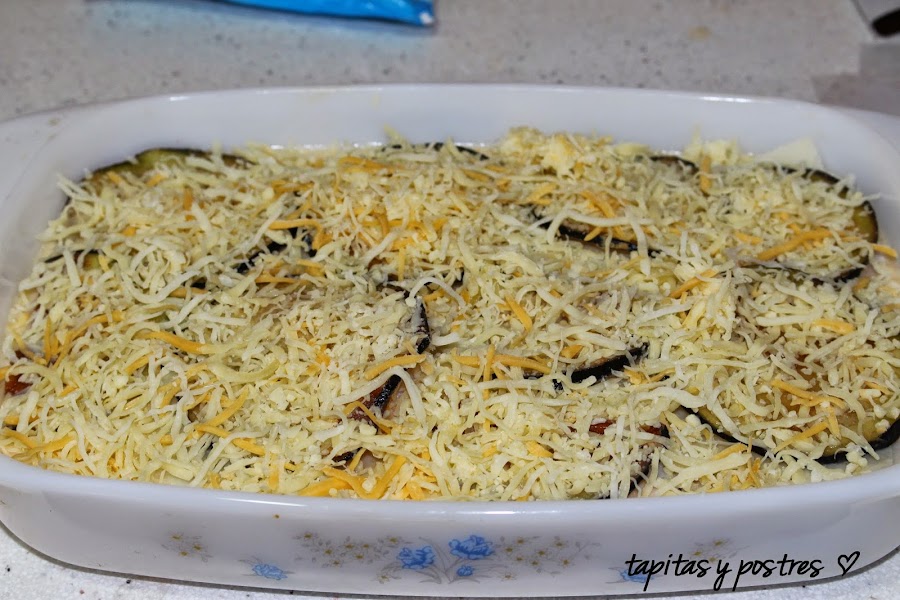 Finalizamos con berenjenas y cubrimos con queso rallado. Al horno.