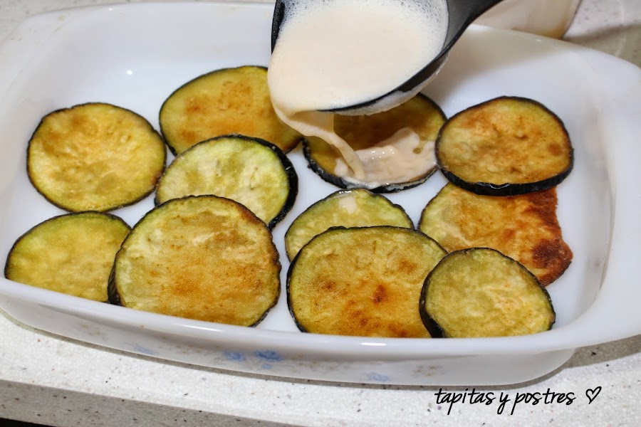 En una fuente de horno, colocamos las rodajas de berenjena y echamos un poquito de la mezcla de leche y huevos.