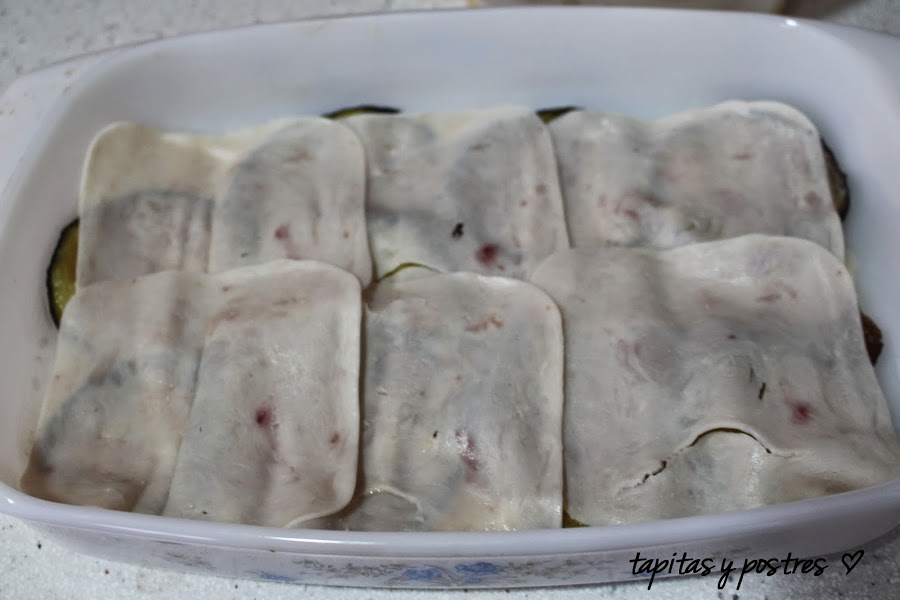 Volvemos a poner una capa de berenjena y así alternando capas de berenjena, crema de leche, jamón y queso... acabamos con una capa de berenjena y echamos el resto de crema de leche y huevos que nos quede.