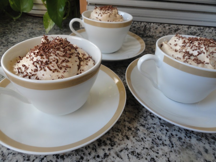Ponemos las hojas de gelatina en agua fría. En un cazo ponemos el medio vasito de leche a calentar, cuando esté templado disolvemos el café, echamos el azúcar, dejamos un poco de azúcar para la nata (crema de leche), y le incorporamos la gelatina bien escurrida. Dejamos calentar pero sin que llegue a hervir. Reservamos y dejamos que se temple. Montamos la nata (crema de leche) bien firme y vamos incorporando poco a poco la mezcla del café, con movimientos envolventes, que no baje mucho la nata (crema de leche). Ponemos en tazas, copas o vasitos y dejamos que enfríe unas horas en el frigorífico. Decoramos con chocolate negro rallado. Yo en la mezcla también puse unos trocitos de chocolate.