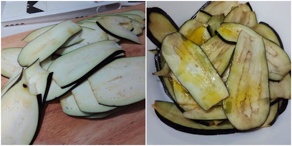 Lavamos las berenjenas y cortamos en lonchas de medio cm aproximadamente. Sazonamos por ambas partes y dejamos en un colador para que escurran el agua y pierdan el amargor unos 30 minutos. Pasado el tiempo, las lavamos y las colocamos sobre papel absorbente para que se sequen. Ahora tenemos 2 opciones: freírlas o hacerlas en el microondas. Yo he optado por esta segunda opción, es más rápido, con menos calorías y también quedan muy ricas. Colocamos las lonchas de berenjena en un recipiente para microondas, vertemos un par de cucharadas de aceite, tapamos y cocinamos unos 8 minutos a máxima potencia.