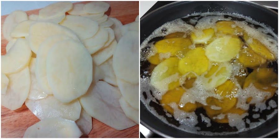Mientras tanto, pelamos las patatas y las cortamos en rodajas del mismo grosor que las berenjenas (mas o menos). Ponemos abundante aceite en una sartén y freímos por tandas para que no se rompan y queden crujientes. Cuando las tengamos listas, escurrimos el exceso de aceite, sazonamos y reservamos.