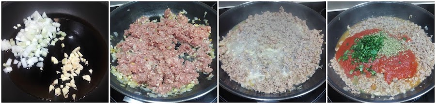 En una sartén, ponemos un chorro de aceite y pochamos la cebolla y el ajo picados. Cuando empiece a tomar color agregamos la carne de cordero picada y salpimentamos. Freímos a fuego medio unos minutos y vertemos un buen chorro de vino blanco, dejamos que reduzca y echamos el tomate, la albahaca fresca picada y el orégano. Cocinamos hasta que quede una salsa espesita. Rectificamos de sal, apartamos del fuego y reservamos.